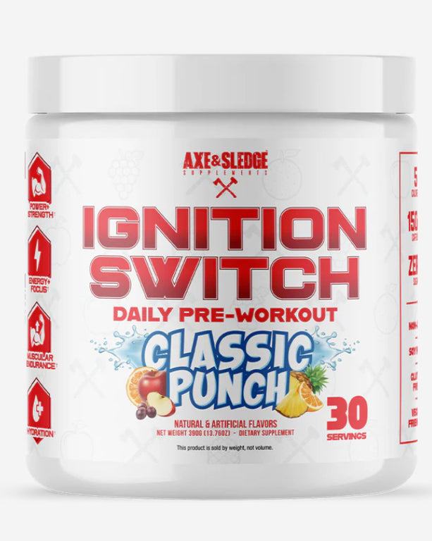 Ignition Switch by Axe & Sledge is a clean, versatile pre-workout formula designed to deliver energized, focused, and high-endurance training sessions — without overwhelming your system with excessive stimulants.