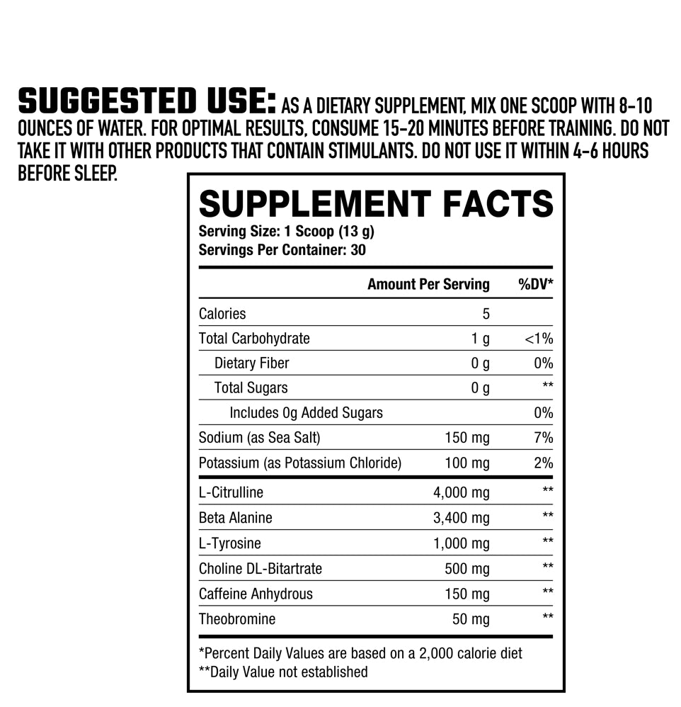Take 1 scoop 15–30 minutes before training, mixed with 8–12 oz. of water. Adjust based on your stimulant tolerance.